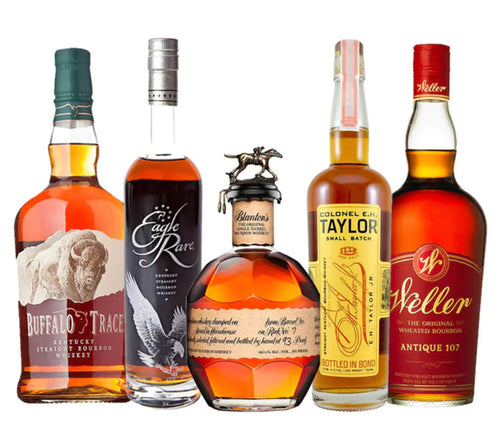 Buffalo Trace:Buffalo Trace Kentucky Straight Bourbon Whiskey is distilled, aged and bottled at the most award-winning distillery in the world. Made from the finest corn, rye and barley malt, this whiskey ages in new oak barrels for years in century old warehouses until the peak of maturity. The taste is rich and complex, with hints of vanilla, toffee and candied fruit. The smooth finish lingers on the palate.Eagle Rare:Carefully aged for no less than ten years makes Eagle Rare a smooth and tasty whiskey. The rareness of this great breed of bourbon is evident in its complex aroma, as well as the smooth and lingering taste. Eagle Rare is a bourbon that lives up to its name with its lofty, distinctive taste experience. It has a nose of complex aromas of toffee, herbs, honey, leather and oak and a taste of dry, oaky flavors with notes of candied almonds and very rich cocoa. A bourbon you truly won't forget.Blanton's Single Barrel:Taken from the center-cut or middle sections of the famous Warehouse H, Blanton’s Original Single Barrel was once designated for ambassadors, dignitaries, and Colonel Blanton’s family and friends. The taste profile is sweet, with notes of citrus and oak. The creamy vanilla nose is teased with caramel and butterscotch, all underscored by familiar baking spices such as clove, nutmeg, and cinnamon.E.H. Taylor Small Batch:Made by hand, this Small Batch Bourbon Whiskey has been aged inside century old warehouses constructed by E.H. Taylor, Jr. Barrels are evaluated and selected to create a perfect blend of distinctive character that is like no other. This bourbon is a true sipping bourbon that honors the uncompromising legacy of E.H. Taylor, Jr.Weller Antique 107:A wheated bourbon with a full-bodied flavor and a balanced palette. Old Weller Antique is bottled at 107 proof, offering a complex taste and bold finish. It’s certainly a recognizable member of the Weller label, with its own unique characteristics to compliment the high proof.(The New Gold Cap Top Edition)This Bundle Contains 5 total (750ml) Bottles Listed Above