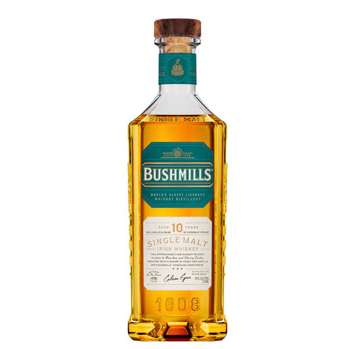 The “youngest” of Bushmills single malt, think of this as the gateway to the greatest single malt whiskeys of the world. Bushmills Single Malt Whiskey 10 year old is triple distilled from 100% malted barley and matured for a minimum of 10 years in former Sherry casks and bourbon-seasoned casks which gives it its honey, vanilla and milk chocolate aroma. Its exceptional complexity is only matched by its approachability, its smoothness. This personal favorite of master blender Helen Muholland can be served neat, over ice or if you’re feeling a little more adventurous, try it frozen.Bushmills Ten Year Old is a very elegant and simple style of Irish Whiskey that leaves you with an exceptionally smooth finish. Triple distilled from 100% malted barley, it has the distinctive Bushmills light fruity aroma that travels over the lip of your tumbler to deliver 10 years of maturation mostly in Bourbon seasoned barrels.Bottle Size: 750ml