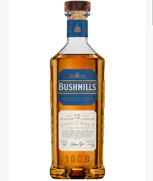 The Bushmills 12 Year Old Single Malt Whiskey is a full-bodied, deep amber whiskey that is both complex and approachable. The whiskey is triple-distilled from 100% malted barley and matured for a minimum of 11 years in former sherry casks and bourbon casks, before combining and finishing for 6-9 months in Marsala wine casks, creating a whiskey rich in dried fruit and nut flavors.Bushmills 12 year old Distillery Reserve Irish Whiskey is matured mainly in former Spanish Oloroso sherry casks which lend a deep amber colour and wonderful smooth taste.Bottle Size: 750ml